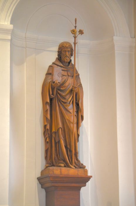Hij wordt vaak afgebeeld met staf waaraan lelies bloeien. Soms met winkelhaak en timmermansgerief, soms met Jezus op de arm en lelietak in de hand. Bij dit beeld houdt Jozef een staf en een boek vast.