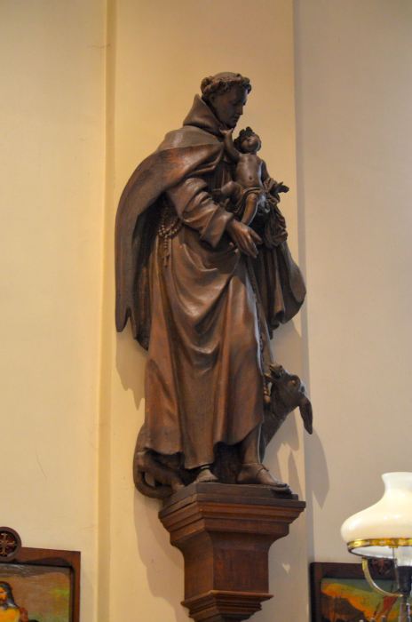 Antonius van Padua (Toontje van de verloren voorwerpen) wordt vaak afgebeeld in Franciscaanse pij met kruisbeeld of lelie in de rechterhand en in de linkerhand een boek waar kind Jezus op zit. Soms op wolk of met ezel naast zich. Bij dit beeld ligt een varken aan zijn voeten terwijl het kind op de linkerhand zit. De lelietak en het boek zijn niet afgebeeld. Antonius van Egypte wordt echter wél altijd afgebeeld met een varken aan zijn zijde. Heeft de kunstenaar hier een fout gemaakt en de twee heiligen door elkaar gehaald?