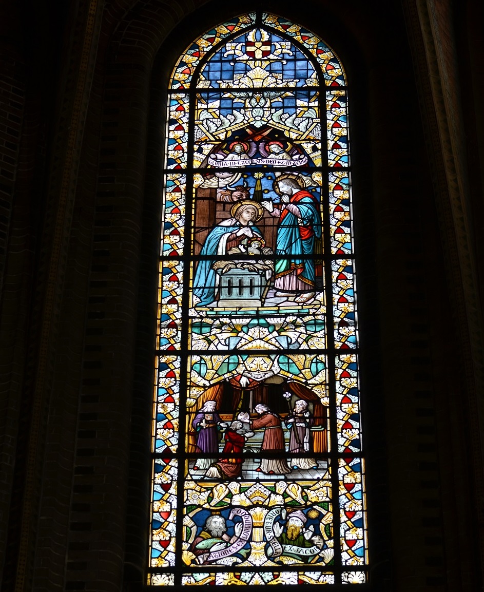 In het hoogkoor zijn zeven vensters aangebracht met afbeeldingen van grote momenten uit het leven van Christus. Van links naar rechts:
