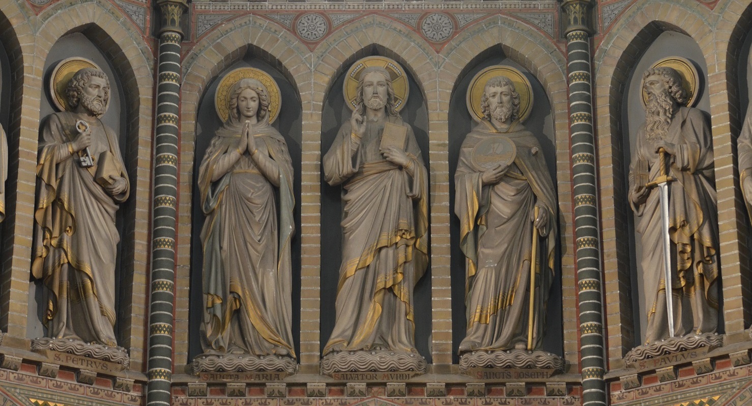 Simon (zaag), Mattheus (boek en bijl), Thomas (boek en ?), Jacobus Maj (boek en staf), Joannes (kelk), Petrus (boek en sleutel), Maria, Christus, Joseph, Paulus (zwaard), Andreas (Andreaskruis en boek), Philippus (boek en kruis), Jacobus Min (boek en stok), (Judas) Thadeus (boek en knuppel) en Bartholomeus (boek en mes).