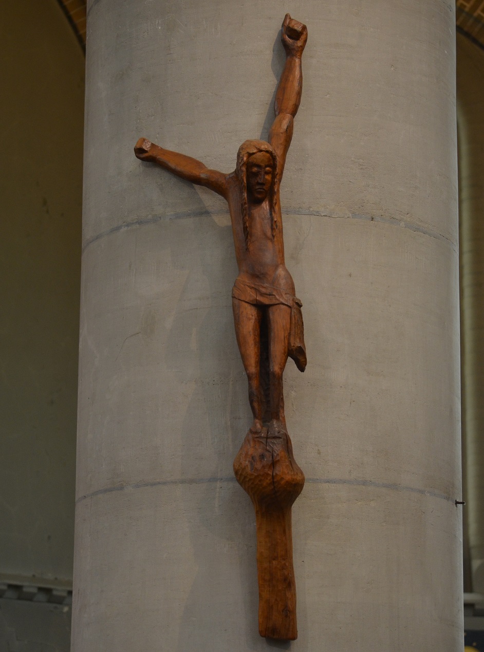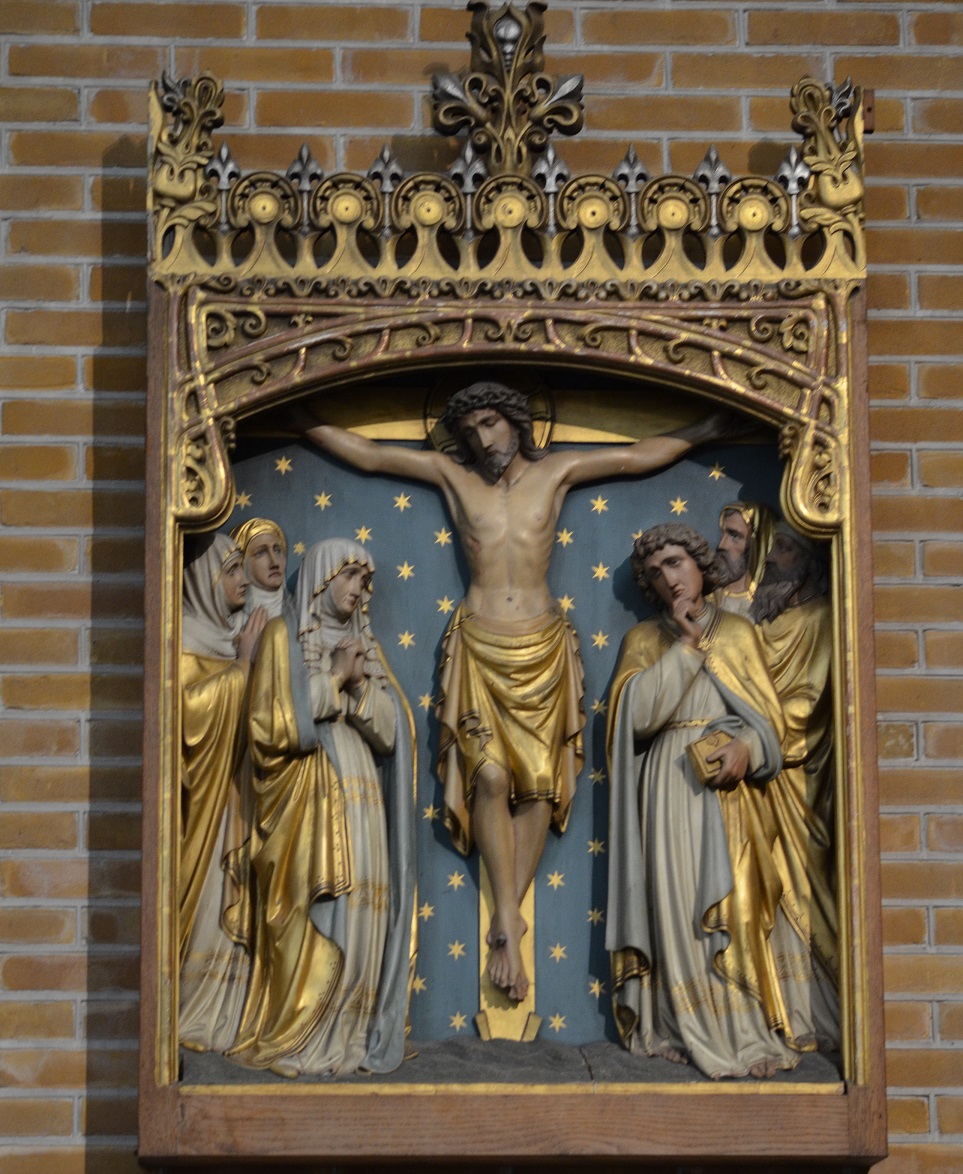 Het paneel is afkomstig van het voormalig altaar. Op paneel zien we de kruisiging van Jezus. De beeldengroep bestaat uit Christus aan het kruis met Maria en Johannes naast zich. De beeldengroep verwijst naar vers Johannes 19,26; Bij het kruis van Jezus stonden zijn moeder met haar zuster, Maria, de vrouw van Klopas en Maria uit Magdala. Toen Jezus zijn moeder zag staan en bij haar een leerling van wie hij veel hield, zei hij tegen zijn moeder: “Dat is uw zoon”, en daarna tegen de leerling: “Dat is je moeder”. Vanaf dat moment nam die leerling haar bij zich in huis.