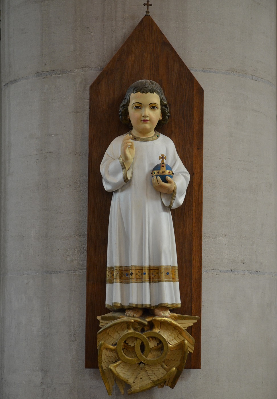 Middenin drie beelden van de heilige Familie: Maria, Jezus en Jozef. Maria heeft de handen gevouwen, Jezus maakt het ‘spreekgebaar‘ en heeft in de linkerhand de bijbel. Jozef draagt een schild met een afbeelding van een schip en in de linkerhand een staf.
