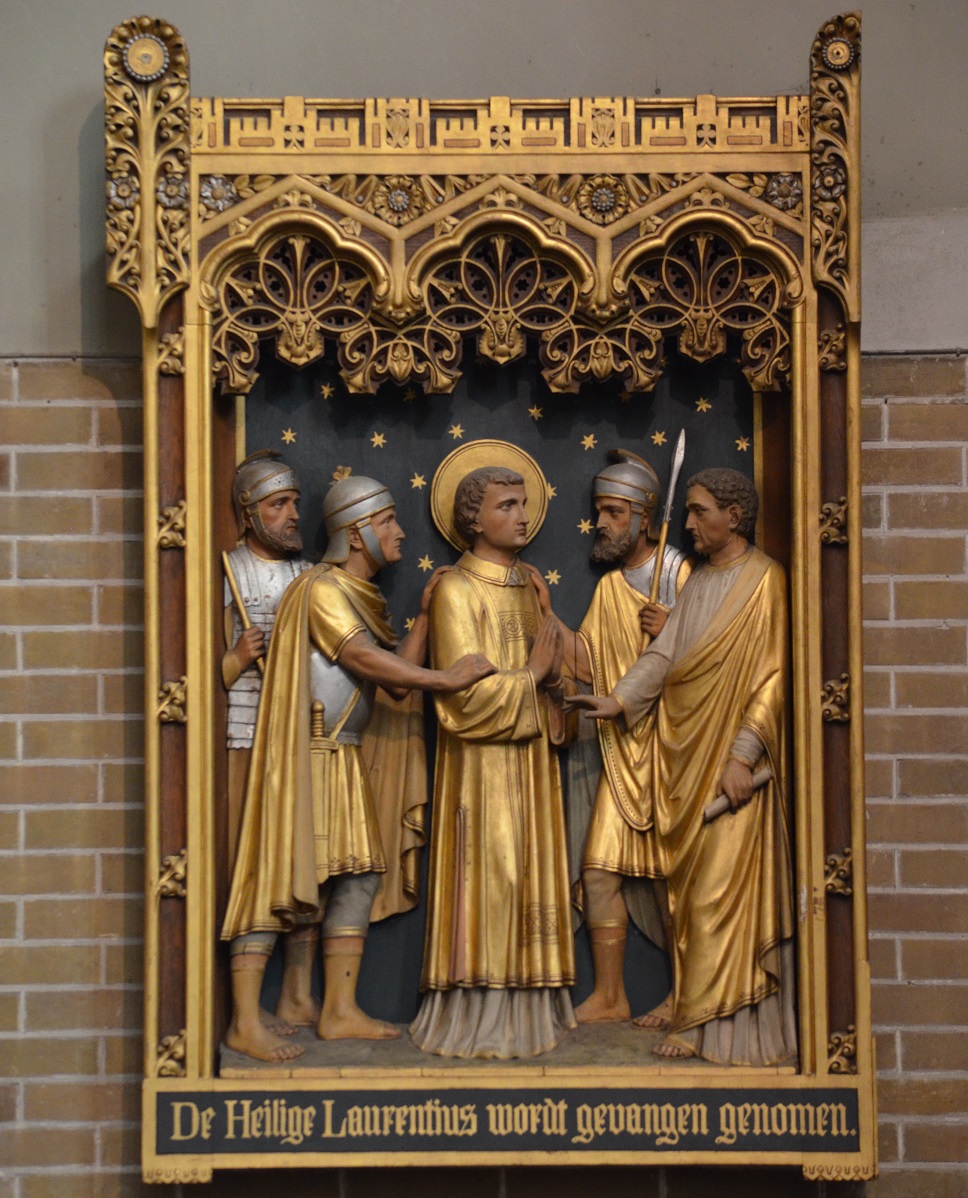 Het reliëf is afkomstig van het voormalige Laurentiusaltaar. Het hangt nu links van het orgel tegen de muur. Laurentius wordt gevangen genomen, hij is omgeven door drie soldaten en een magistraat met een wetsrol.