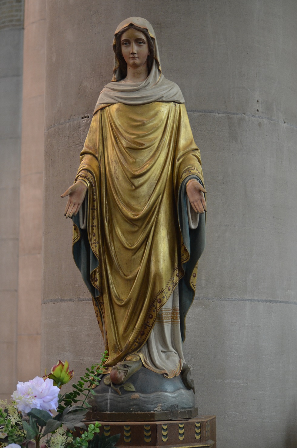 Maria staat op een slang. De slang is het symbool van het kwaad. Maria vertrapt de kop van een slang, de overwinning van de zonde. De beeltenis is grotendeels gebaseerd op de Openbaring van Johannes, waar staat: “Er verscheen een groot teken aan de hemel: een vrouw, bekleed met de zon, de maan onder haar voeten” (Openbaring. 12, 1) en het verhaal op van de zondeval uit Genesis, waar God tegen de slang zegt: “Vijandschap sticht ik tussen u en de vrouw, tussen uw kroost en het hare. Het zal uw kop bedreigen, en gij zijn hiel” (Genesis 3, 15).