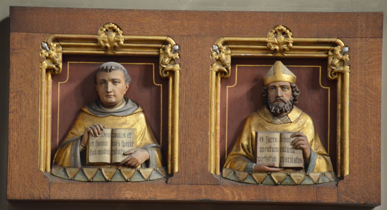 Thomas van Aquino met de tekst: “DEUS ET HOMO SUB MODICI PANIS ET VINI SPECIE SENTINETUR”. Vertaling: “God en mens wordt begrepen/gevoeld onder de gedaante van brood en wijn”.