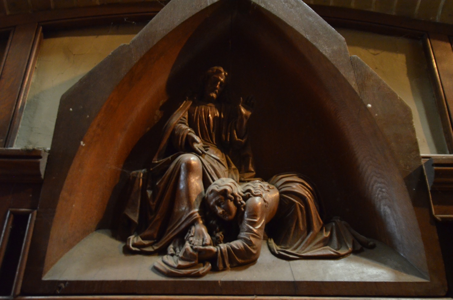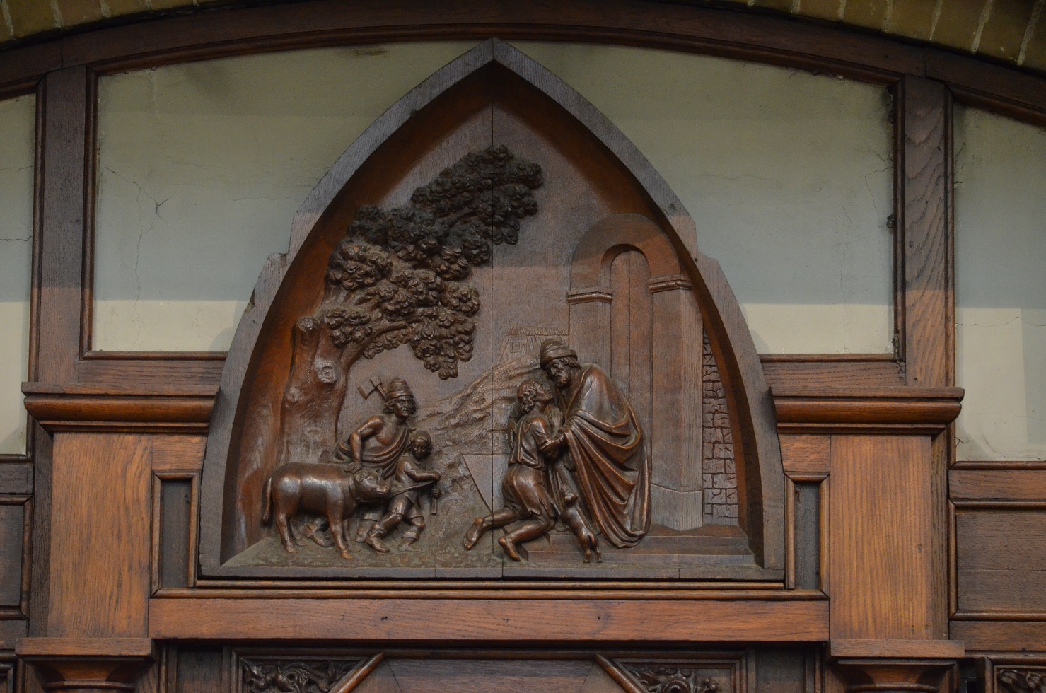 Boven de twee biechtstoelen zijn aan iedere zijde timpanen van fraai houtsnijwerk aangebracht die het thema vergeving dragen. Beide zijn afkomstig uit de vroegere kerk.