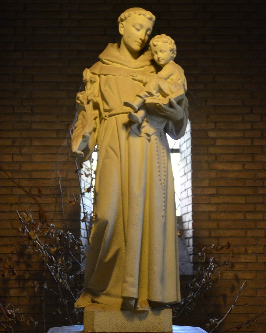 Het beeld van Antonius bevindt zich achterin de kerk. Antonius sloot zich in 1210 aan bij de augustijnen in Lissabon. In 1212 verhuisde hij naar Coimbra om niet langer door familieaangelegenheden gestoord te worden in zijn geestelijke ontwikkeling. Onder de indruk gekomen van de eerste martelaren van de minderbroeders sloot hij zich in 1220 bij hen aan. Hij trok naar Noord-Afrika om daar het christelijk geloof te verspreiden onder de moslims. Later was zijn werkterrein Frankrijk en Italië. Waarschijnlijk werd hij in 1222 te Forlì tot priester gewijd. Veel mensen vonden door zijn toedoen de weg naar het katholieke geloof. Op last van Franciscus van Assisi doceerde hij theologie aan zijn medebroeders. In 1227 benoemde Johannes Parenti, de toenmalige generaal-overste van de minderbroeders hem tot provinciaal van de Romagna in Italië, waar hij van 1222 tot 1224 al predikend had rondgetrokken. In 1230 vroeg en kreeg hij ontslag omdat zijn gezondheidstoestand verslechterde. Hij stierf in 1231 en werd nog geen jaar later door paus Gregorius IX heilig verklaard. In 1946 werd hij als ‘leraar van het evangelie’ tot kerkleraar uitgeroepen.