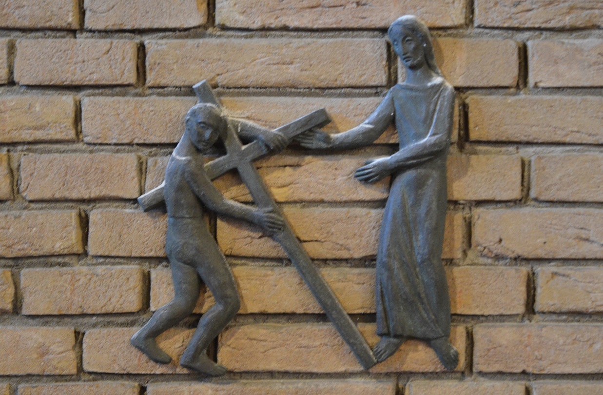 5. Simon van Cyrene helpt Jezus het kruis te dragen.