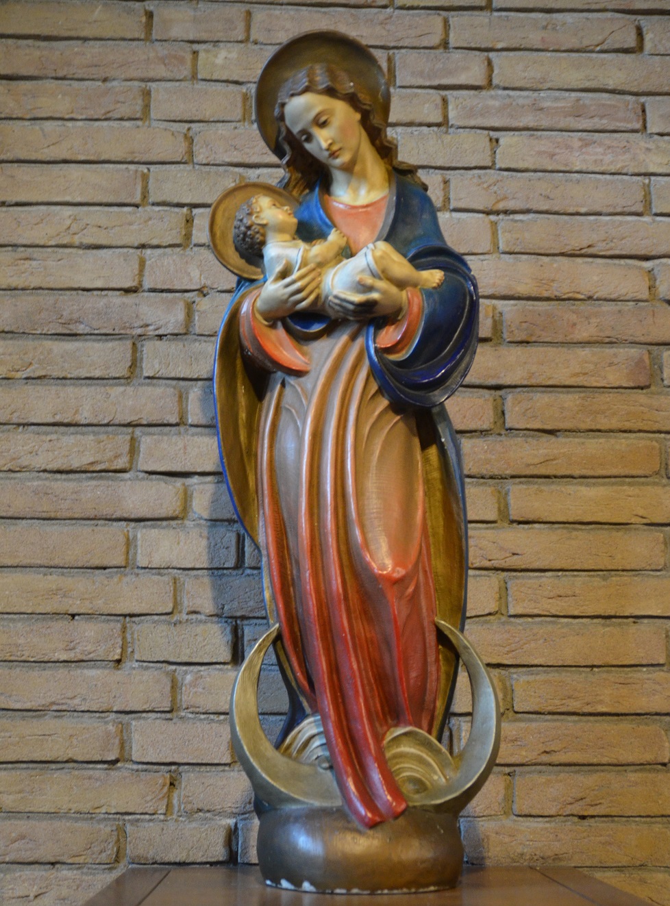 Maria draagt op haar arm Kind Jezus. Staande op een maansikkel met een lerende Jezus op haar arm, is Maria de koningin van de hemel maar ook de zorgende en bemiddelende Moeder van haar Zoon.