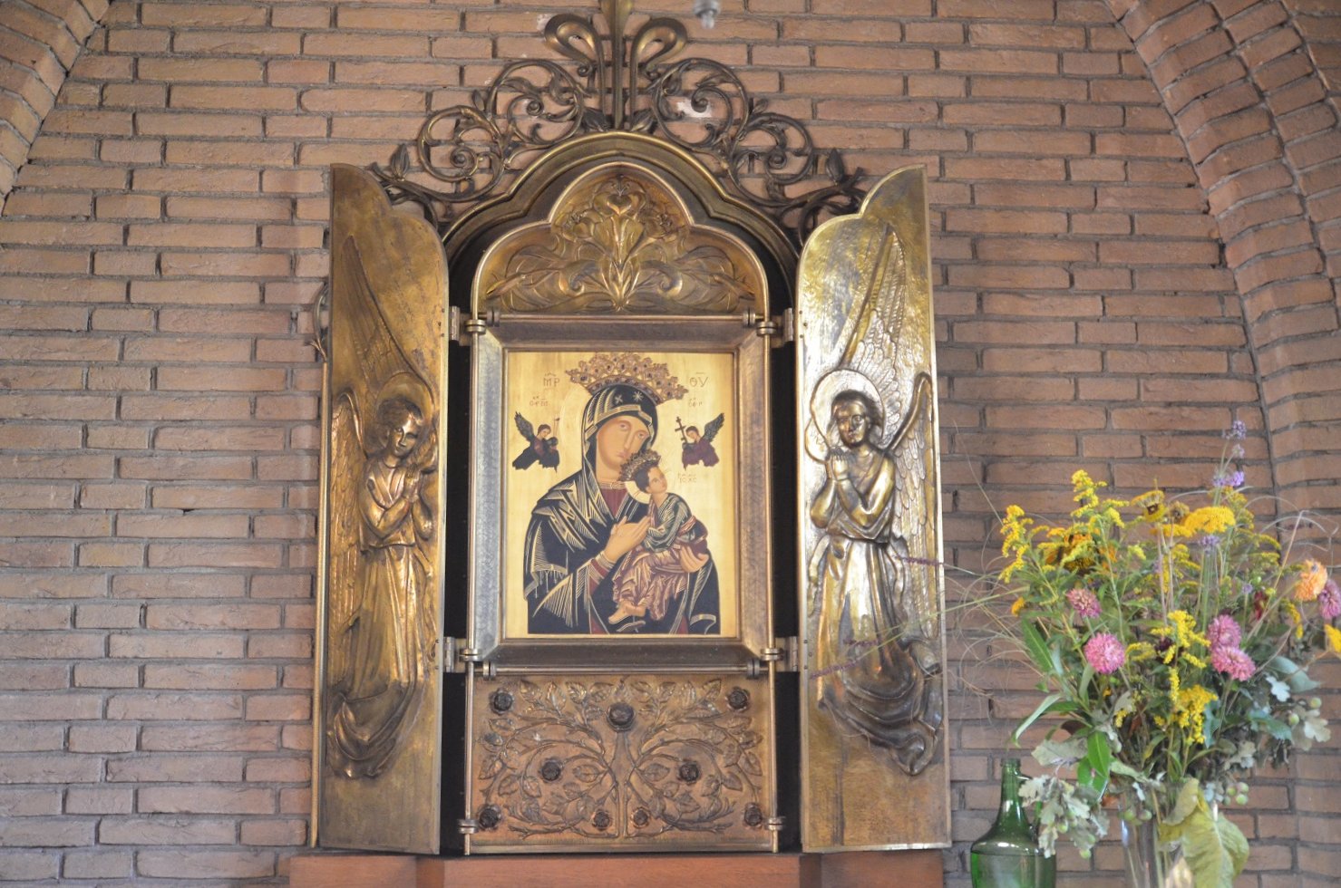 Dit retabel is voorzien engel afbeeldingen op de linker en rechter deur. Op het midden paneel is Maria met kind Jezus afgebeeld. Zowel Maria als wel Jezus zijn gekroond.