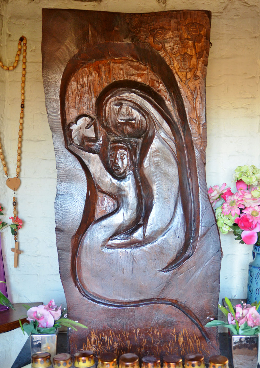 In 2000 is dit houten paneel (zie foto) van pastoor Omer Gielliet in het kapelletje geplaatst. Hij hakte Maria van ‘de Roosberg’ uit de stam van een tamme kastanje. Rechts bovenin verwijzen de rozen naar deze naam. De roos heeft als bloem ook een speciale band met Maria, die “roos zonder doornen” genoemd wordt, omdat zij vrij is van zonden. De naam Roosberg heeft overigens niets van doen met deze bloem. Waarschijnlijk heeft het woord “roos” hier zijn oorsprong in het riet dat hier vroeger gegroeid kan hebben. Gielliet verwijst naar deze begroeiing aan de onderzijde van het beeld. Maria heeft het kind op haar arm, de duif op zijn hand symboliseert de Heilige Geest, een teken van hoop.