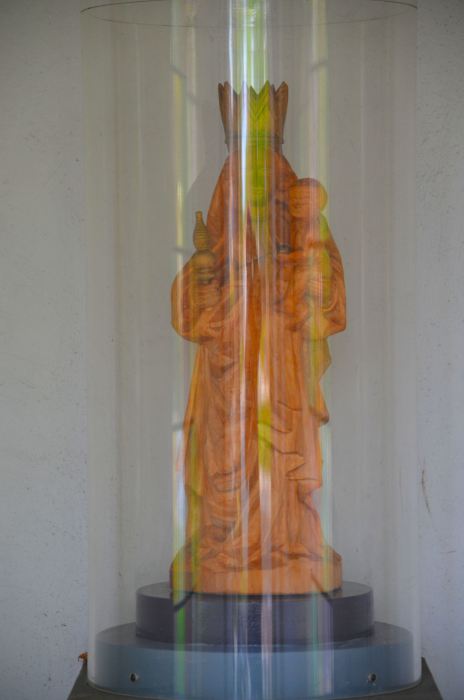 Door de weerspiegeling van de stolp is het kleine Mariabeeldje slecht zichtbaar.
