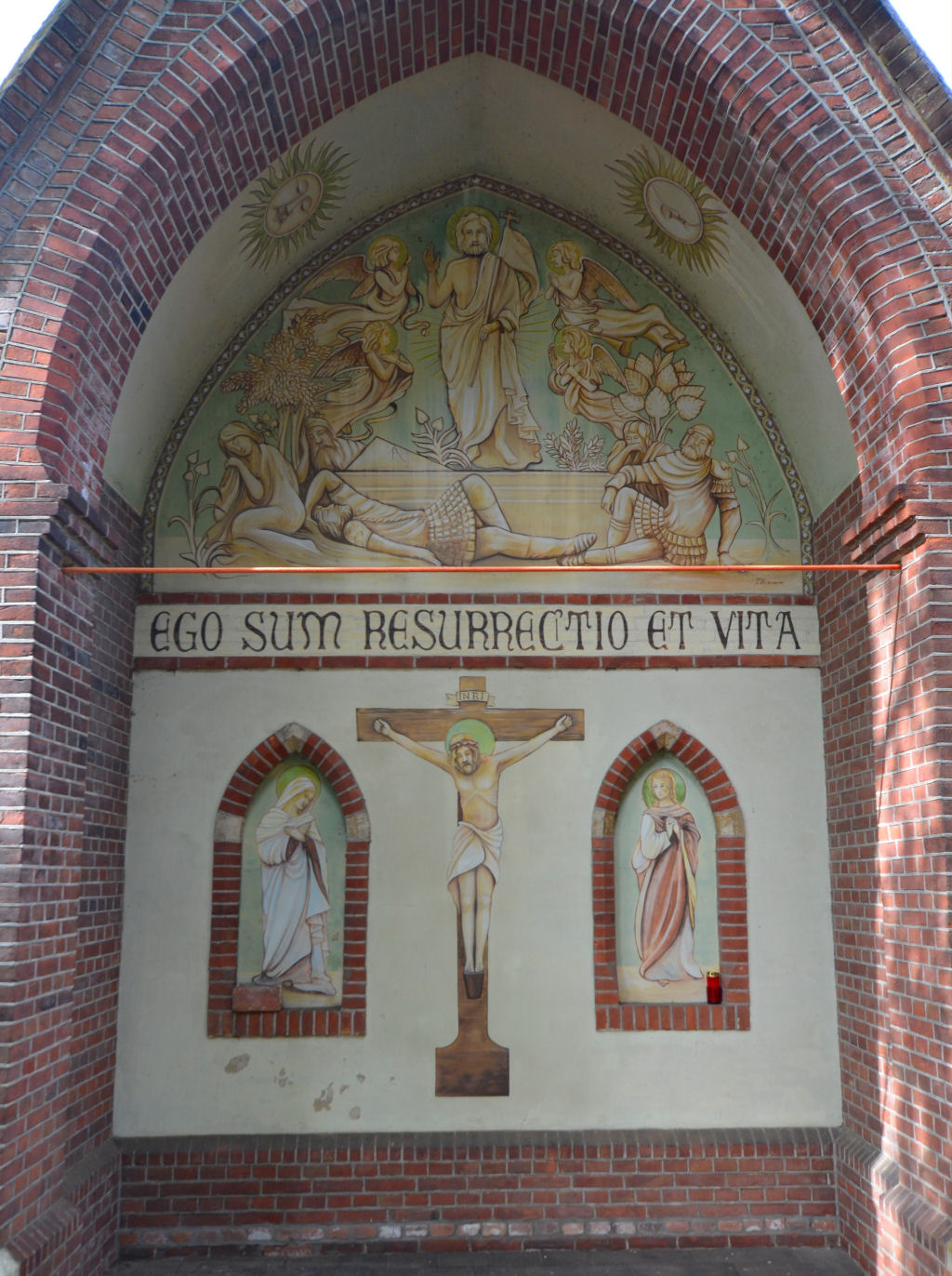 Op de afbeelding is de tekst “ego sum resurrectio et vita” weergegeven hetgeen staat voor “Ik ben de opstanding en het leven”.