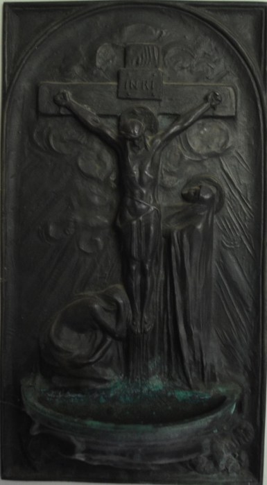 In de voorruimte van het kapelletje bevindt zich dit kleine wijwater bakje met een afbeelding van Christus aan het kruis omgeven door twee vrouwen. Het zijn zijn moeder en Maria Magdalena. Maria Magdalena was aanwezig bij de kruisiging van Jezus (volgens Marcus 15:40; Matteüs 27:56,61; Johannes 19:25; Lucas noemt haar niet expliciet) en volgens Marcus en Matteüs ook bij de graflegging (Marcus 15:47; Matteüs 27:61; Lucas vermeldt ongenaamde vrouwen, Johannes vermeldt geen vrouwen). Ze was de eerste die bij het lege graf van Jezus kwam (Marcus 16:1-8; Matteüs 28:1-10) en de eerste die Jezus zag na zijn opstanding (Johannes 20:1-18). Toen ze dit vertelde aan de apostelen, geloofden ze haar niet en vonden het kletspraat (Lucas 24:9-11).