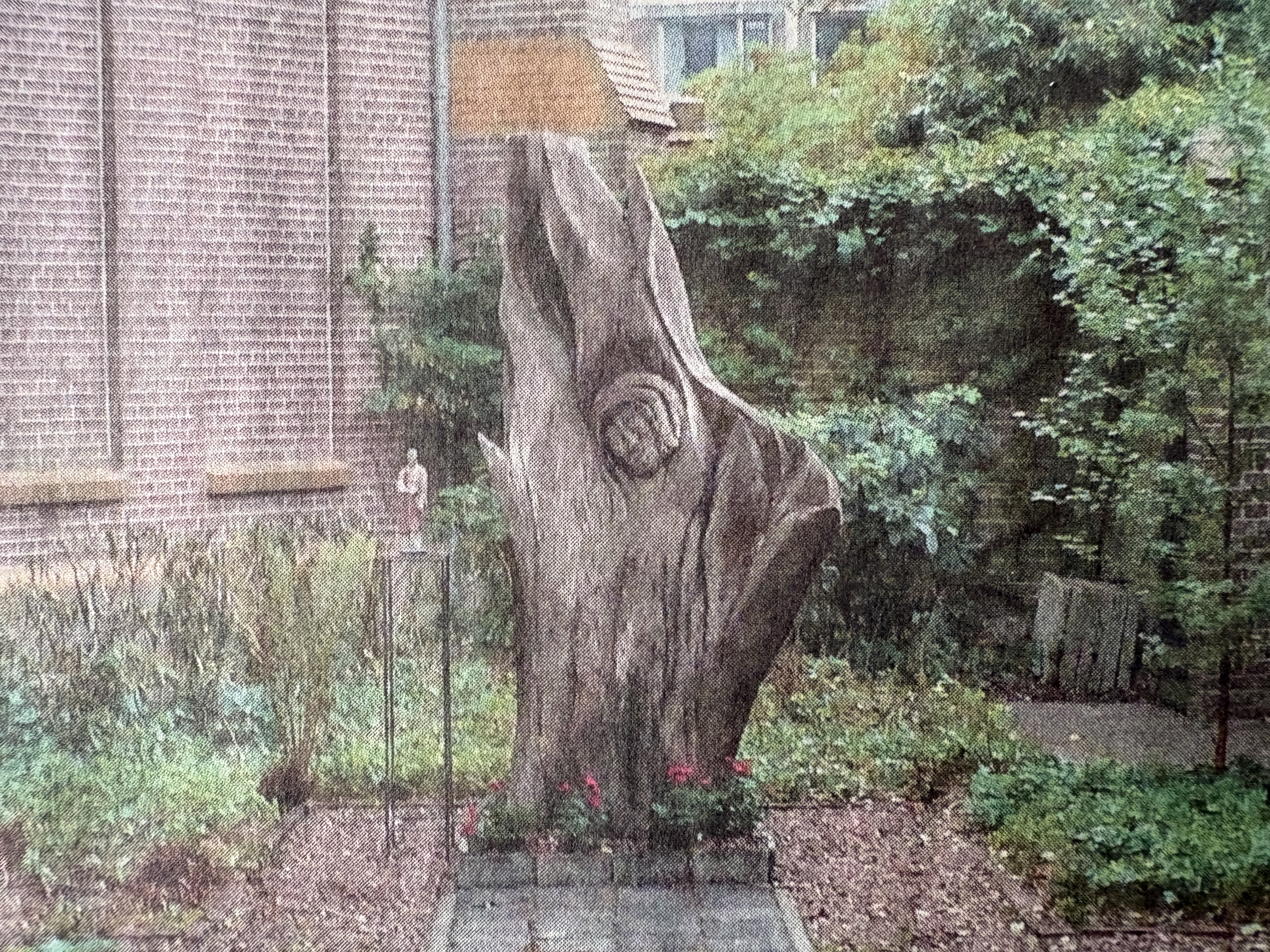 Het beeld staat enigszins verscholen op het binnenpleintje aan de achterzijde van het Surplus woonzorgcentrum.