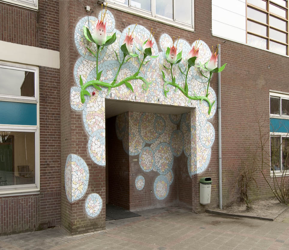 Voor basisschool De Zandberg ontwierp hij een poort; een kunstwerk dat de kleuterentree accentueert. Vooral met zijn keuze voor een uitbundige combinatie van kleuren slaagde hij er in om de ratjetoe aan architectuur rondom het speelplein weer samenhang te geven. In lichtgeel, roze en babyblauw bracht hij een tegelmozaïek aan op de muren rondom de ingang. Met die zachte pasteltinten, maar ook met de ronde vormen – die het midden houden tussen roze wolken en bellenblaasbellen, zoekt hij aansluiting bij de belevingswereld van de jonge gebruikers van deze entree. Op het tegelpatroon schroefde hij twee smeedijzeren takken in gifgroen, die samen een speelse poort vormen. Daarop werden zalmroze bloemen gemonteerd met felgele stampers. De bloemen kregen gezichtjes als smiley’s, met elk een andere uitdrukking. Zo ontstond een feestelijke entree op die plaats waar voor alle kinderen de schoolloopbaan begint. En de school is er blij mee.