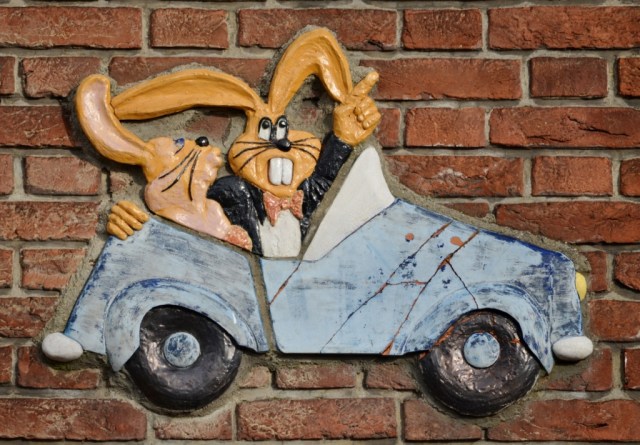 Afbeelding van twee amoureuze konijntjes in auto, afgeleid door een luchtballon. Ad Haarhuis van de firma Ad Ballon sponsorde de kunstenaar met een ballonvlucht voor zijn film Mission Ville uit 1989. Als dank voor maakte hij deze gevelsteen.